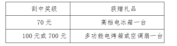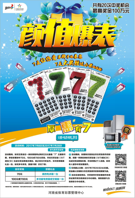 活動時間:2017年7月8日至2017年7月28日?;顒悠陂g,彩民在我省任一體彩銷售網點購買20元面值“7”主題即開票,單張彩票刮中70元、100元或700元獎級,并經兌獎設備(IVT或BCR)完成兌獎且剪角處理后,除正常兌付獎金外,另可獲得精美禮品一份,彩民多中多獎,數量不限!詳見下表: