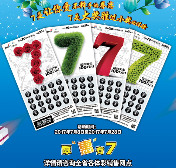 體驗頂呱刮新票“7”,新感覺贏大獎,樂在“7”中;邂逅在最美的季節(jié),購新票拿好禮,“7”樂無窮!