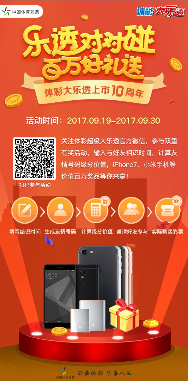 本次活動(dòng)于2017年9月19日至30日在體彩超級大樂透官方微信進(jìn)行?;顒?dòng)以體彩大樂透10周年為背景,以“友誼”為主題,采用線上、線下相結(jié)合的活動(dòng)方式,為彩友們提供了雙重好禮。活動(dòng)期間,彩友們只要關(guān)注體彩超級大樂透官方微信,點(diǎn)擊底部“樂透有禮”菜單即可進(jìn)入活動(dòng)頁面,或掃描活動(dòng)二維碼直接進(jìn)入頁面參與。在活動(dòng)首頁點(diǎn)擊“碰碰運(yùn)氣”,輸入與好友的相識(shí)時(shí)間,根據(jù)相關(guān)信息生成一注緣分號碼?;顒?dòng)根據(jù)緣分號碼10年來歷史累計(jì)中獎(jiǎng)獎(jiǎng)金進(jìn)行排行,每日根據(jù)排行榜派發(fā)相應(yīng)獎(jiǎng)品。同時(shí),彩友們還可在每周一、三、六體彩大樂透開獎(jiǎng)當(dāng)期,到線下體彩投注站購買自己相應(yīng)的緣分號碼,并通過活動(dòng)平臺(tái)上傳該注號碼的彩票序列號贏取更多獎(jiǎng)品。