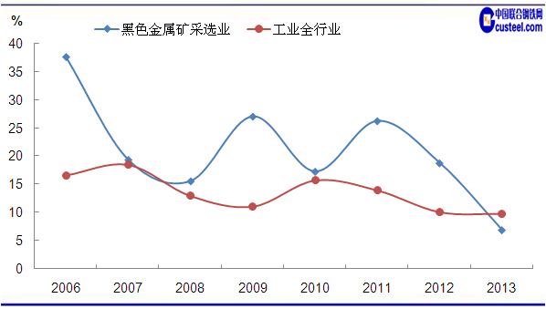 圖1 2006-2013年工業(yè)全行業(yè)及鐵礦業(yè)工業(yè)增加值增速情況 數(shù)據(jù)來(lái)源:中國(guó)統(tǒng)計(jì)局