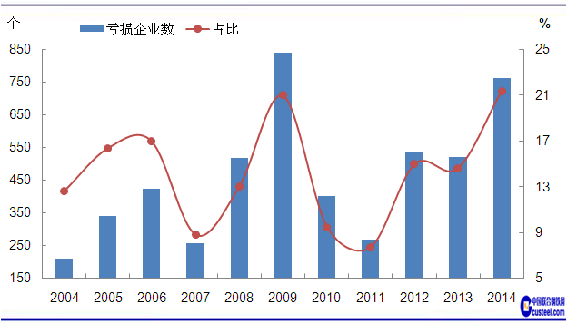 圖3 2004-2014年鐵礦采選業(yè)虧損企業(yè)數(shù)和占比變化走勢(shì) 數(shù)據(jù)來(lái)源:中國(guó)統(tǒng)計(jì)局