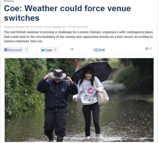 英國奧委會主席塞巴斯蒂安-科表示,降雨已對后勤方面造成很大的問題,而盡快想出應(yīng)對方法和緊急方案也被提上日程。他同時承認,賽艇比賽和馬術(shù)比賽是本屆奧運會比賽的兩個主要室外項目,而由于場地構(gòu)造這兩個地點非常容易受陰雨天氣的影響。