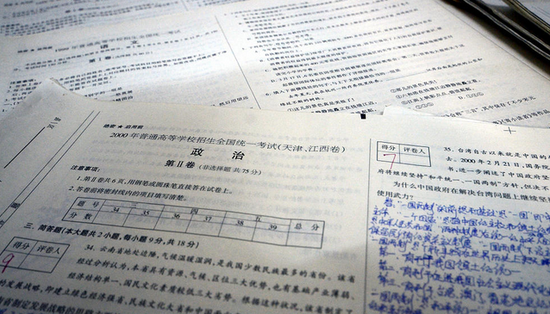 甘福保說,收藏高考試卷是一種情懷,他會一直堅持下去。圖為甘福保收藏的高考試卷。
