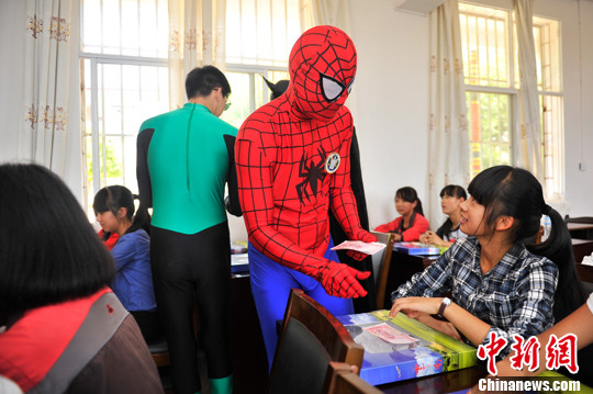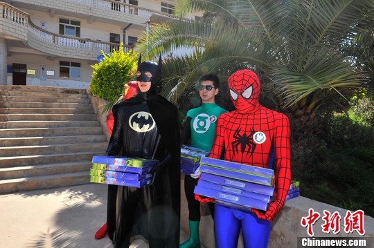 5月29日,在六一兒童節(jié)來(lái)臨之際,祥鵬航空的安全員變身超級(jí)英雄,來(lái)到云南省昆明市晉寧縣的學(xué)校,為長(zhǎng)期資助的困難學(xué)生送上兒童節(jié)禮物。中新社發(fā) 劉冉陽(yáng) 攝
