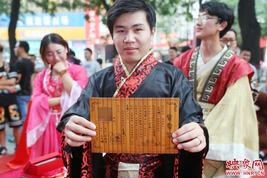 下午17點(diǎn)30分,鄭州二七廣場(chǎng)附近的一處小廣場(chǎng)前熱鬧非凡,8對(duì)年輕男女身著古裝,參加愛的“賣身契”簽約儀式。