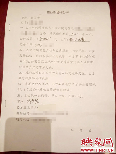 現(xiàn)場的居民向記者出示了當(dāng)時的一份購房協(xié)議書,房屋售賣甲方的一欄赫然寫著“郭炎嶺”的名字。