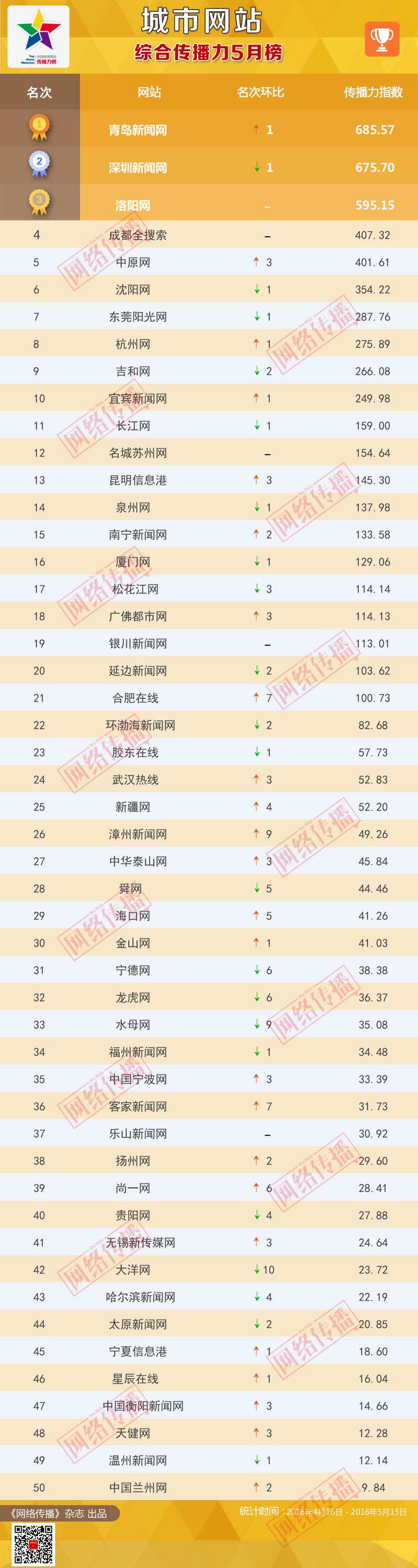 中央網(wǎng)信辦《網(wǎng)絡(luò)傳播》雜志傾力打造的“城市網(wǎng)站傳播力2016年5月榜”今日正式發(fā)布。榜單顯示,青島新聞網(wǎng)、深圳新聞網(wǎng)、洛陽網(wǎng)位列綜合傳播力榜前三甲;青島新聞網(wǎng)、深圳新聞網(wǎng)、成都全搜索位居PC端傳播力榜前三名;兩微傳播力榜前三名分別是洛陽網(wǎng)、中原網(wǎng)、成都全搜索。