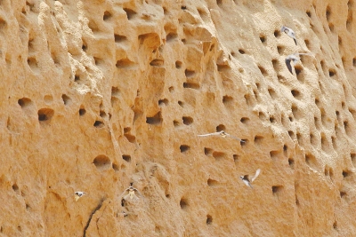 記者在現(xiàn)場看到,堆壁上崖沙燕的小洞穴似拳頭大小,密密麻麻,難以數(shù)清。天空中,不少小燕子正在“苦練”飛翔,嘰嘰喳喳的鳴叫聲此起彼伏;洞穴里,嗷嗷待哺的燕寶寶好奇地伸頭張望,透過攝影記者的長鏡頭,記者觀察到,好多洞穴內還有燕子喂食小燕的暖心畫面。