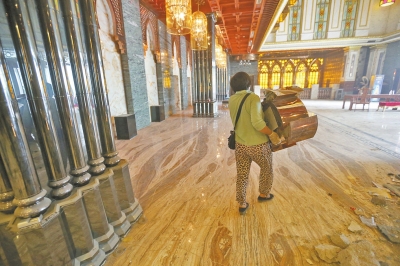 大廳內(nèi),金碧輝煌的樓頂和墻體以及各種燈飾等都還沒有拆除,大廳東側(cè)的一處1尺高的平臺正在拆除。在切割、拉扯、裝卸等雜音交響中,東北角一名工人拿著大錘對著室內(nèi)非承重墻猛砸,已砸出一個大窟窿。很顯然,這里正進行大規(guī)模拆除。
