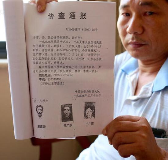 當(dāng)年被通緝的幾個(gè)人,被認(rèn)定嫌疑最大的王某躍至今未歸案。村民推斷,一個(gè)人較難完成殺人、埋尸、抬柜子掩藏。而且,葉縣警方信息顯示,王某躍患有精神疾病。不久后,公安局下發(fā)了協(xié)查通報(bào)稱,王某坡、王某躍、王某輝系父子三人,“將鄰居一6歲小男孩騙至家中害死,后外逃?!?/p>