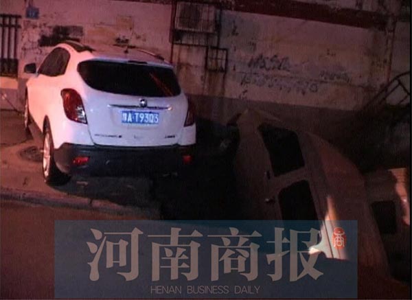 鄭州新鄭路凌晨現(xiàn)深坑 路邊兩車掉入坑中