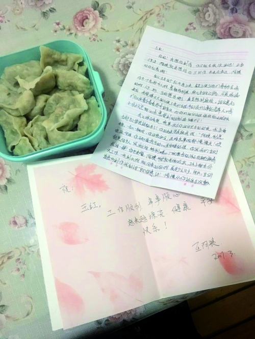 ” 接過餃子的董玉紅感到很意外,緊接著,王大娘又從包里掏出了一封信和一張賀卡,一起遞到了董玉紅手中。打開信的一瞬間,董玉紅眼里的淚花打著轉(zhuǎn),“沒有想到,王大娘會親自給我寫了這么長的一封信……”