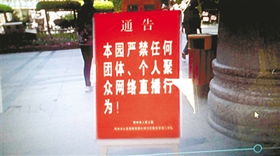 4月19日上午,市民王先生來(lái)電稱,紅極一時(shí)的人民公園的尬舞被叫停了,不知什么原因。上午10時(shí),記者來(lái)到人民公園東門,進(jìn)門就看到一張紅紙告示“本園嚴(yán)禁任何團(tuán)體、個(gè)人聚眾網(wǎng)絡(luò)直播行為!”