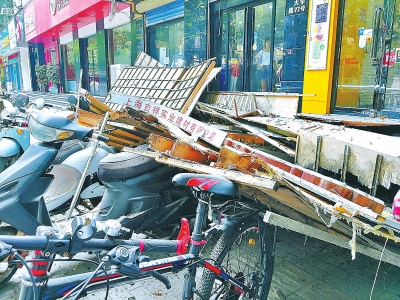 本報(bào)訊8月5日下午1時(shí)40分左右,鄭州市民李女士逛過(guò)大學(xué)路一家沿街服裝店,轉(zhuǎn)身剛剛離去,只聽(tīng)見(jiàn)轟的一聲巨響,店鋪的門頭招牌墜落。約20平方米的門頭招牌,砸中了店前幾輛電動(dòng)車,幸未殃及行人。