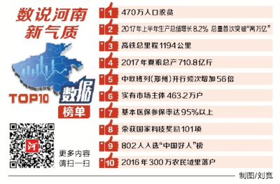 根據網友投票結果和專家評審意見,這份令人矚目的榜單最終揭開神秘“面紗”。其中,470萬人口脫貧、2017年上半年生產總值增長8.2%總量首次突破“兩萬億”和高鐵總里程1194公里名列前三位,2017年夏糧總產710.8億斤、中歐班列(鄭州)開行頻次增加56倍、實有市場主體463.2萬戶、基本醫(yī)保參保率達95%以上、榮獲國家科技獎勵101項、802人入選“中國好人”榜、2016年300萬農民城里落戶等7個數據也榜上有名。