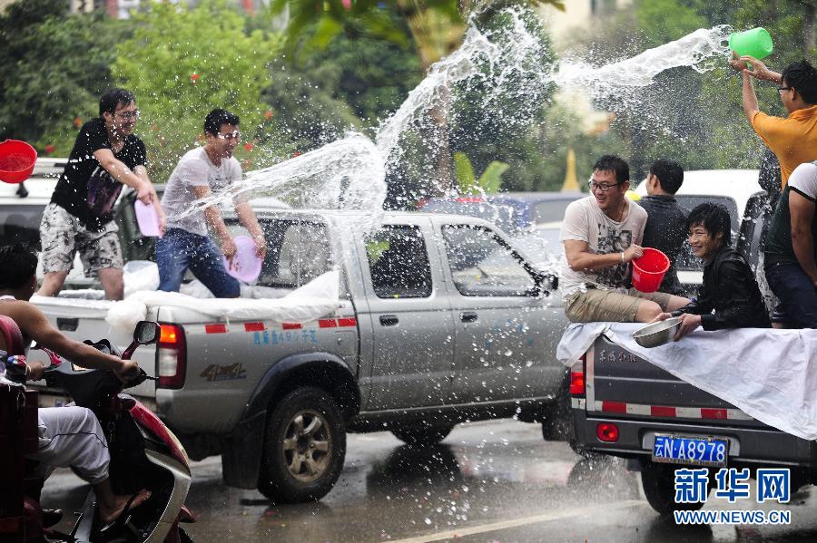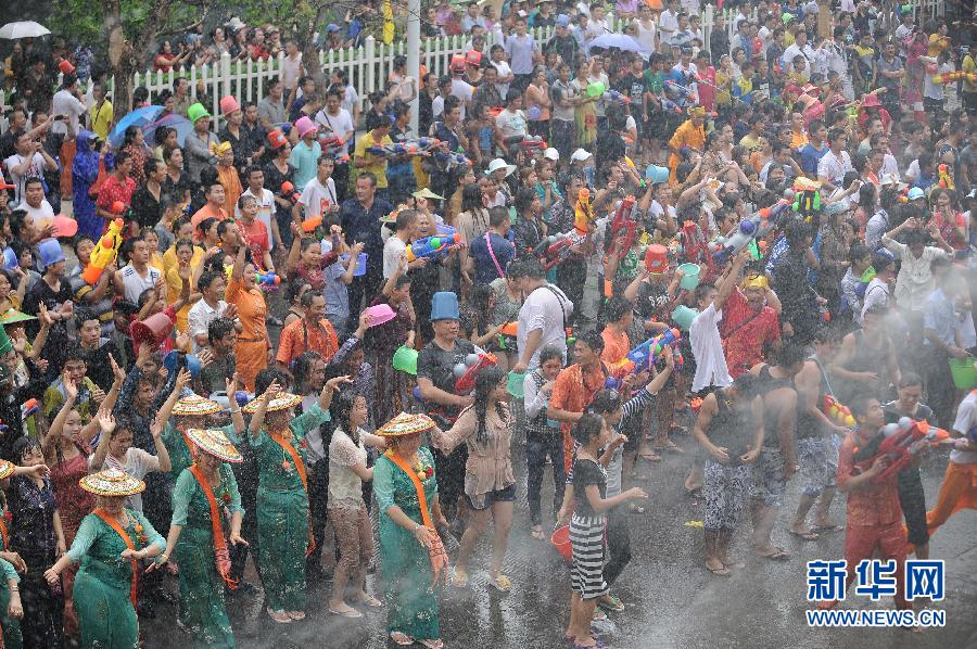 4月12日,當(dāng)?shù)厝罕娫诘潞昝⑹畜w驗(yàn)潑水狂歡。當(dāng)日,云南省德宏傣族景頗族自治州繼續(xù)舉行2013年國際潑水狂歡節(jié),各族群眾和游客歡聚在德宏芒市廣場狂歡潑水,祈福吉祥平安。 新華社記者張可任 攝
