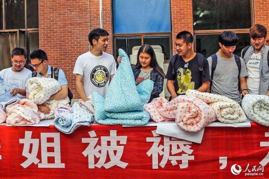 2015年05月31日,北京,清華大學生物科技學院大三學生小磊(左一)花800元買下了兩套學姐的被子。清華大學生物科技學院的大三學生小磊說,他在閑魚app上花了近800元拍下了兩床學姐的舊被子,就旁人看來這簡直就是“天價”,可小磊卻稱 “不貴!學姐馬上要回韓國了,我仰慕她三年,留樣東西給自己作個念想也好”,小磊說。