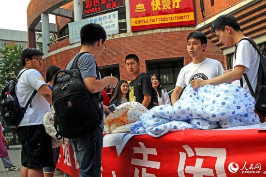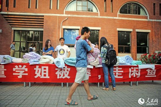 2015年05月31日,北京,清華大學大三學生小龍在宿舍樓旁擺起了攤位,一則“大量畢業(yè)學姐被褥”的廣告語,引發(fā)大量學子圍觀。2015年05月31日,北京,清華大學大三學生小龍在宿舍樓旁擺起了攤位,一則“大量畢業(yè)學姐被褥”的廣告語,引發(fā)大量學子圍觀。