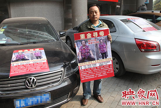 如果市民看到這樣一位老人,可以撥打映象網(wǎng)熱線電話0371-65887251與我們聯(lián)系,或是直接撥打司先生電話13461320888聯(lián)系。對(duì)于見到老人主動(dòng)收留并與司先生聯(lián)系找到老人的,司先生及其家人將提供20000元現(xiàn)金作為酬謝。