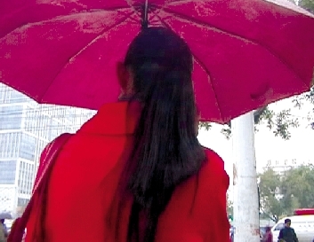 下午2時(shí),航海路與大學(xué)路交叉口附近,一襲紅衣的張女士雨中擎?zhèn)阈凶咴谌诵械郎稀?/p>