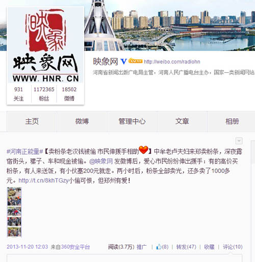 《老漢錢被盜,鄭州市民網(wǎng)友義買粉條》微博發(fā)布于2013年11月19日,當(dāng)天,映象網(wǎng)記者在街頭采訪,偶遇中牟縣的一位農(nóng)家老漢與老伴到鄭州賣粉條,不料騾子被偷,錢也被盜。映象網(wǎng)迅速發(fā)布新聞,并連續(xù)發(fā)布多條微博,呼吁市民網(wǎng)友伸出援手幫助兩位老人,迅速引發(fā)關(guān)注,短時(shí)間內(nèi)轉(zhuǎn)發(fā)量超過200次,閱讀量接近20萬次,引發(fā)眾多愛心市民網(wǎng)友前往購買粉條,400多斤粉條在兩個(gè)小時(shí)內(nèi)被搶購一空,丟失的騾子也成功找回。