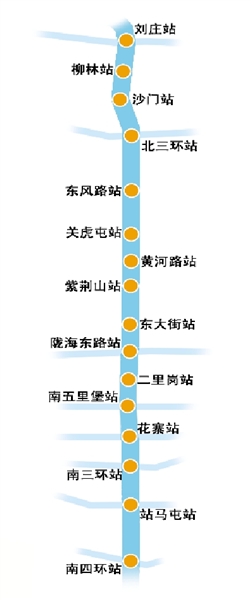 地鐵2號線為城市南北向軌道骨干線,其中一期工程起于劉莊站,止于南四環(huán)站,設(shè)車站16座,線路長20.6公里,沿花園路、紫荊山路敷設(shè)。