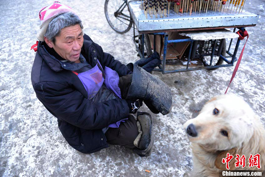 2月6日,在長春市一條繁華的街路上,一只小狗幫助身殘主人拉車賣冰糖葫蘆,成為長春冬日街頭一道感人的風景線。據(jù)主人介紹,雖然自己身殘且貧窮,但并不想靠別人救濟度日,因此學會了制作冰糖葫蘆的手藝,并以此自食其力。而他養(yǎng)的這條小狗“大黃”也是對主人不離不棄,每日都會幫助主人拉車外出謀生。圖為主人在整理捆綁腿的帶子。張瑤 攝