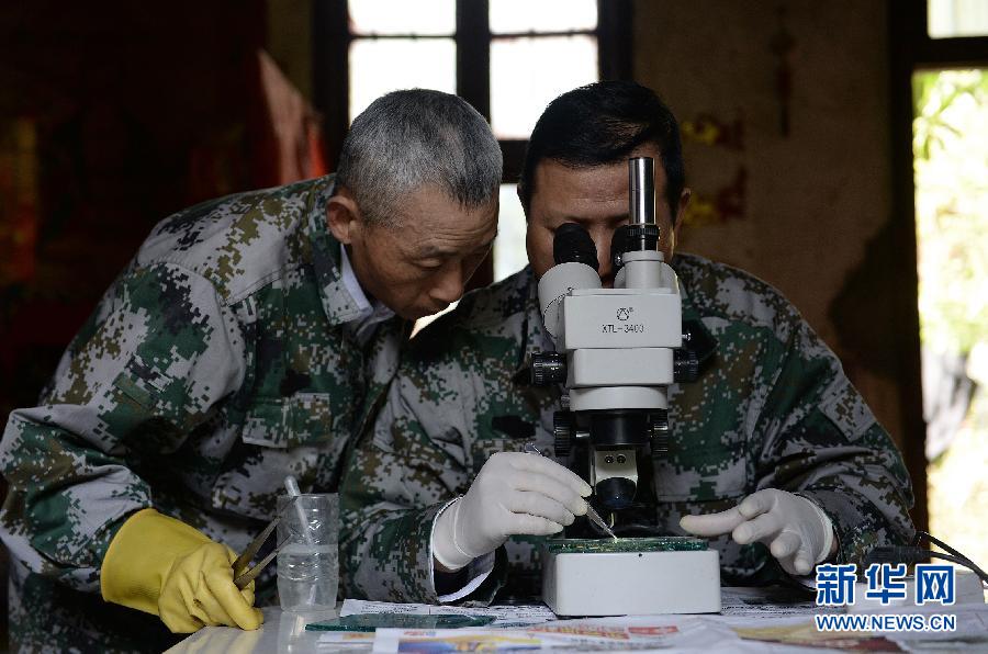 在租住當?shù)剞r民的房子里,滅螺隊員熊林根(右)用顯微鏡觀察當天收集的釘螺樣本(4月14日攝)。 新華社記者 萬象 攝