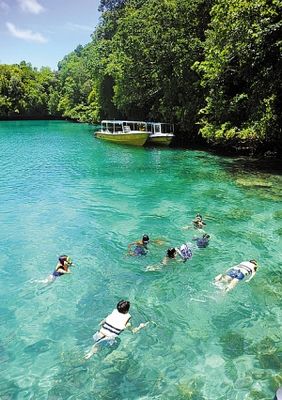 說帕勞是一個(gè)水漾的天堂,一點(diǎn)也不為過。這里不僅以海底景觀聞名于世,被海洋學(xué)家公認(rèn)為世界七大海底奇觀之首,海面景觀也同樣令人贊嘆。由于帕勞的海水清澈無污染而其海底景觀造型奇特,一會(huì)兒是黑黑的礁石,一會(huì)兒是斑斕的軟硬珊瑚,抑或是細(xì)細(xì)沙礫,還有遠(yuǎn)古時(shí)代沉積的火山灰,這一切都被清澄的海水毫無保留地映上了海面,令海水有7種不同的顏色,這讓每一位到此地的游客都贊嘆不已,更成為潛水者的勝地。