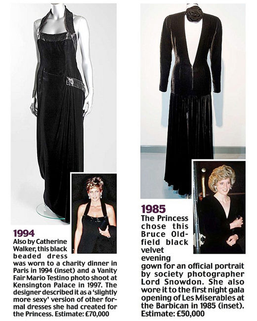 右:Bruce Oldfield黑色天鵝絨晚禮服。出現(xiàn)在Lord Snowdon為戴安娜王妃拍攝的皇室官方照片中。估價(jià):5萬英鎊