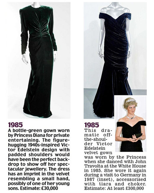 左:Catherine Walker深海綠色亮片禮服。1989年戴安娜王妃穿著該禮服在奧地利進(jìn)行國事訪問。估價(jià):5萬英鎊