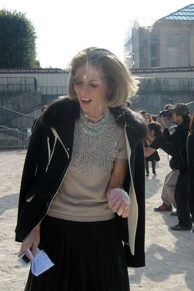 2005年,巴黎時(shí)裝周場(chǎng)外,安娜·溫圖爾(Anna Wintour)因?yàn)閷?duì)皮草的熱愛(ài)而受到動(dòng)物權(quán)利保護(hù)者餡餅的“攻擊”發(fā)型遭到毀滅性的沖擊。