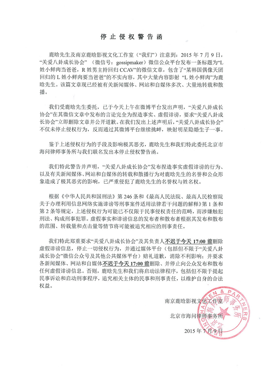 鹿晗先生及南京鹿晗影視文化工作室(“我們”)注意到:2015年7月9日,“關(guān)愛八卦成長協(xié)會”(微信號:gossipmaker)微信公眾平臺發(fā)布一條標題為“L姓小鮮肉當爸爸,R姓男主持回歸CCAV”的微信文章,包含了“某韓國偶像天團回歸的L姓小鮮肉要當爸爸”的不實內(nèi)容,其中大量內(nèi)容影射“L姓小鮮肉”為鹿晗先生。該篇文章現(xiàn)已經(jīng)被有關(guān)新聞媒體、網(wǎng)站和自媒體多次、大量地轉(zhuǎn)載和散播。