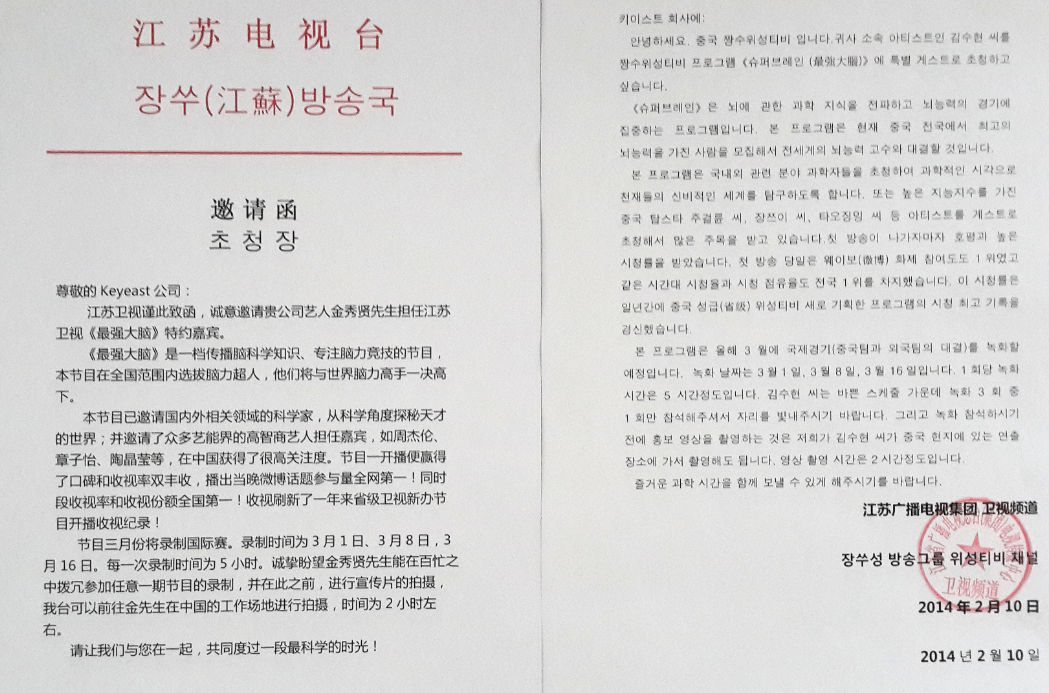 應廣大粉絲的強烈呼聲,江蘇衛(wèi)視決定邀請金秀賢參加《最強大腦》國際PK賽的錄制。昨日中午,江蘇衛(wèi)視《最強大腦》在其官方微博發(fā)布了一條重磅消息:節(jié)目組已于2月10日向“都教授”金秀賢所屬的韓國經(jīng)紀公司Keyeast發(fā)出邀請函,誠意邀請其擔任《最強大腦》的特約嘉賓。