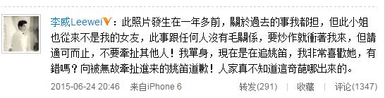 6月24日晚,李威發(fā)布微博回應(yīng)“照片門”,表示“此照片發(fā)生在一年多前,關(guān)于過(guò)去的事我都擔(dān),但此小姐也從來(lái)不是我的女友,此事跟任何人沒有毛關(guān)系,要炒作就沖著我來(lái),但請(qǐng)適可而止,不要牽扯其他人!我單身,現(xiàn)在是在追姚笛,我非常喜歡她,有錯(cuò)嗎?向被無(wú)故牽扯進(jìn)來(lái)的姚笛道歉!人家真不知道這奇葩哪出來(lái)的?!?/font>