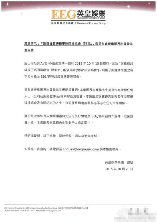 謝霆鋒發(fā)聲明否認辦演唱會:保留追究權利