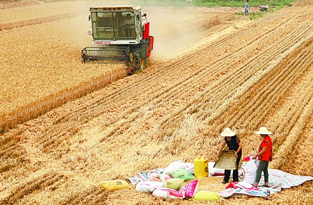 截至6月10日17時,全省已收獲小麥面積7240萬畝,接近九成,其中機(jī)收面積7124萬畝,機(jī)收率98%。商丘麥?zhǔn)战咏猜?,洛陽麥?zhǔn)粘^九成。目前麥?zhǔn)罩饕性谠ケ钡貐^(qū)。