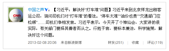 【習(xí)近平:解決好“打車難”問(wèn)題】習(xí)近平來(lái)到北京祥龍出租客運(yùn)公司,詢問(wèn)司機(jī)們對(duì)“打車難”的看法?!巴\囂y”“油價(jià)也貴”“交通部門應(yīng)松綁”……司機(jī)們爭(zhēng)相發(fā)言。習(xí)近平表示,今天開(kāi)了個(gè)神仙會(huì),大家講的很實(shí)際,有關(guān)部門要擇其善者而從之。行勝于言,要標(biāo)本兼治,科學(xué)施策,解決好這個(gè)問(wèn)題。