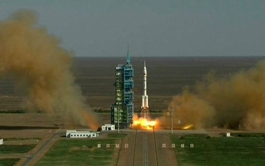 6月11日17時(shí)38分許,長征二號(hào)F遙十運(yùn)載火箭在酒泉衛(wèi)星發(fā)射中心中國載人航天發(fā)射場順利點(diǎn)火起飛,將神舟十號(hào)載人飛船發(fā)射升空。電視截圖