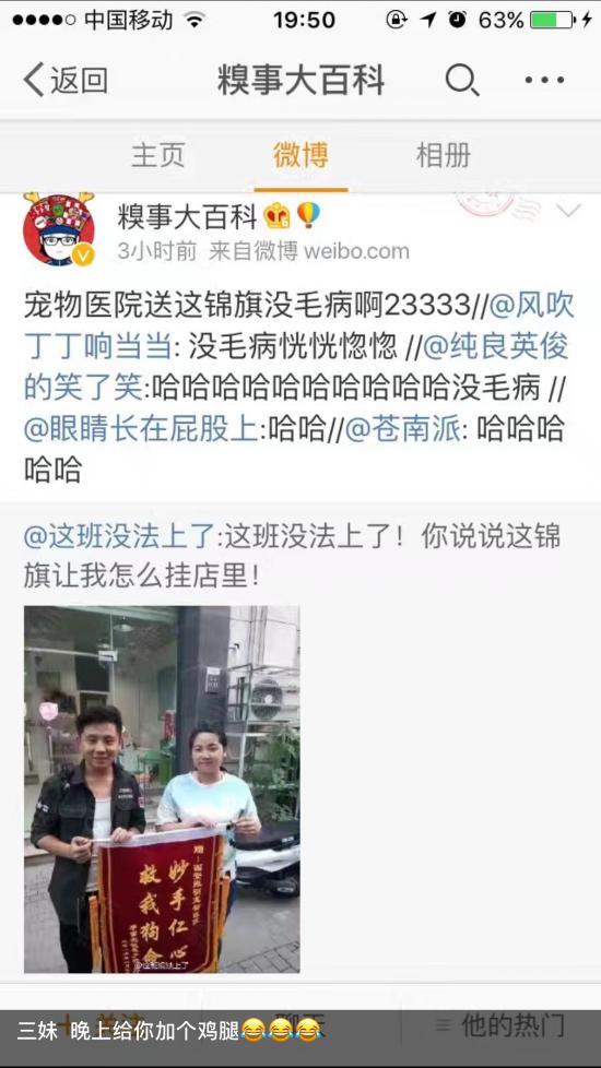 “狗狗三妹是今年4月份送到這里醫(yī)治的,8月7日送來了錦旗,和我們醫(yī)護人員合影。沒想到最近突然在微博火了,一覺醒來,很多客戶叫我網(wǎng)紅?!闭衩鲗櫸镝t(yī)院院子孫振明說,有人贊揚勇氣,有人嘲笑謾罵,但如果你要是知道事情的始末,你就不會覺得可笑?這是一個關(guān)于愛、守護和堅持的故事。