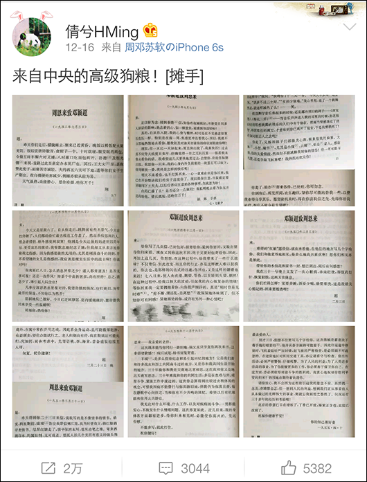 最近,新浪博主@倩兮HMing 送上了這把跨越數(shù)十年的,來(lái)自中央的高級(jí)狗糧:1942至1955年,9封周恩來(lái)與鄧穎超的往來(lái)書(shū)信。
