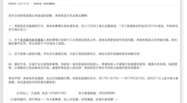 聲明還表示,央企入股更多細(xì)節(jié)洽談問(wèn)題,來(lái)財(cái)街高層正在積極對(duì)接,恰在接近春節(jié)區(qū)間,所以安排于19日給員工放假。聲明還聲稱平臺(tái)并無(wú)逾期兌現(xiàn),假期后會(huì)如數(shù)兌現(xiàn)。