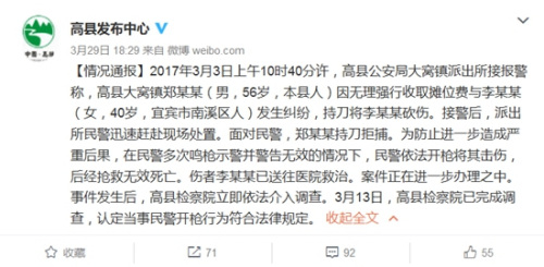 2017年3月3日上午10時40分許,高縣公安局大窩鎮(zhèn)派出所接報(bào)警稱,高縣大窩鎮(zhèn)鄭某某(男,56歲,本縣人)因無理強(qiáng)行收取攤位費(fèi)與李某某(女,40歲,宜賓市南溪區(qū)人)發(fā)生糾紛,持刀將李某某砍傷。