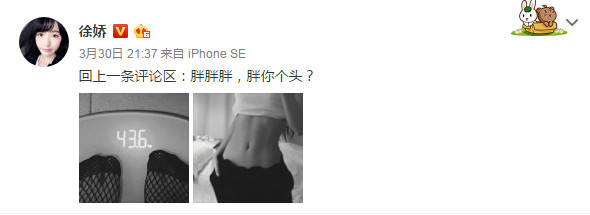 只見徐嬌親自站上體重機,測量并公開真實體重是43.6公斤,配合164公分的身高,身材其實相當(dāng)纖瘦,不僅如此,接著更大膽掀起白色上衣,露出隱藏的腹肌和小蠻腰,并寫下:“回上一條評論區(qū):胖胖胖,胖你個頭?”真性情引起粉絲狂贊。