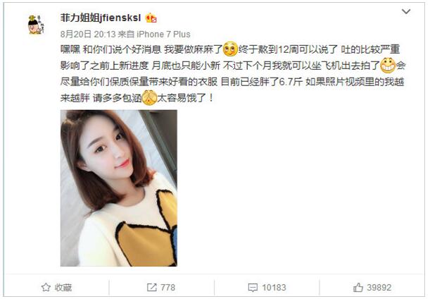 8月20,雪莉在小號(hào)微博@“菲力姐姐jfiensksl ”公布懷孕:“嘿嘿,和你們說個(gè)好消息,我要做媽媽了,終于熬到12周可以說了,吐的比較嚴(yán)重,影響了之前上新進(jìn)度,月底也只能小新,不過下個(gè)月我就可以坐飛機(jī)出去拍了。會(huì)盡量給你們保質(zhì)保量帶來好看的衣服,目前已經(jīng)胖了6.7斤,如果照片視頻里的我越來越胖,請(qǐng)多多包涵,太容易餓了! ”