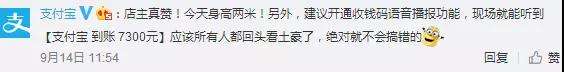 對此,支付寶官方表示,建議開通收錢碼語音播報(bào)功能,現(xiàn)場就能聽到“支付寶到賬7300元”,應(yīng)該所有人都回頭看土豪了,絕對就不會搞錯的。