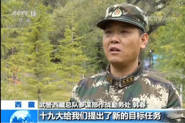 武警西藏總隊(duì)參謀部作戰(zhàn)勤務(wù)處 韓春:十九大給我們提出了新的目標(biāo)任務(wù),在新時(shí)代,作為守衛(wèi)祖國邊疆的武警官兵,按照習(xí)主席講的那樣,一定要有新氣象新作為,始終扎根高原、立足崗位,為實(shí)現(xiàn)強(qiáng)軍目標(biāo)作出積極貢獻(xiàn)。