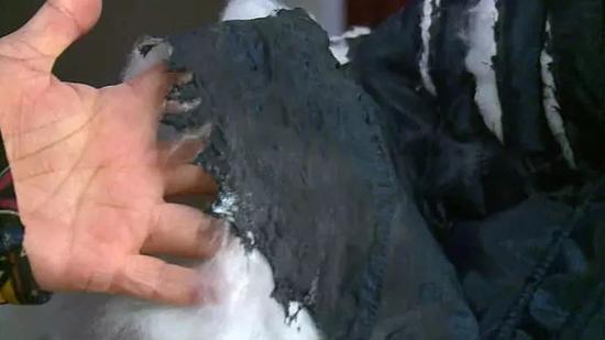 老人家告訴我們,一大早他和老伴收拾行李準(zhǔn)備去鄉(xiāng)下,在廚房里拾掇的老伴身上羽絨衣突然爆炸,衣服背面出現(xiàn)了好幾個大窟窿,索性人沒有大礙。