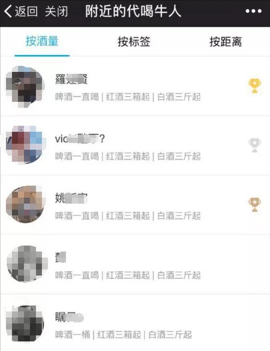懷著對這項“神服務(wù)”的好奇,韓國記者還在中國特地體驗了一番。據(jù)《中央日報》報道,4日晚,韓國記者辦公室所在的北京市中心建國門一帶,記者嘗試使用了該軟件。建國門這附近還不算娛樂區(qū)域,但在半徑400米以內(nèi)地圖上跳出10名代喝人的位置。記者在點擊其中一名代喝人后立即彈出他的自我介紹——“奧運(yùn)會金牌級喝酒選手”,“酒量是白酒兩瓶、啤酒一箱”。