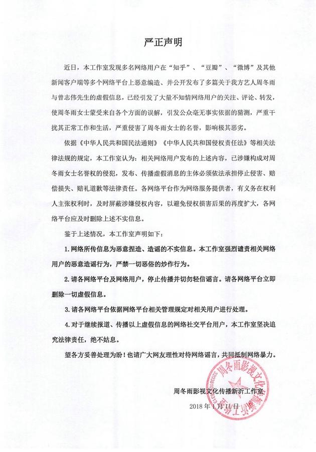 對(duì)于此傳聞,周冬雨工作室今天中午發(fā)布聲明否認(rèn)此傳聞,稱此傳聞嚴(yán)重侵害周冬雨名譽(yù),影響極其惡劣。表示強(qiáng)烈譴責(zé)惡意造謠行為,希望廣大網(wǎng)友理性對(duì)待網(wǎng)絡(luò)謠言,共同抵制網(wǎng)絡(luò)暴力。
